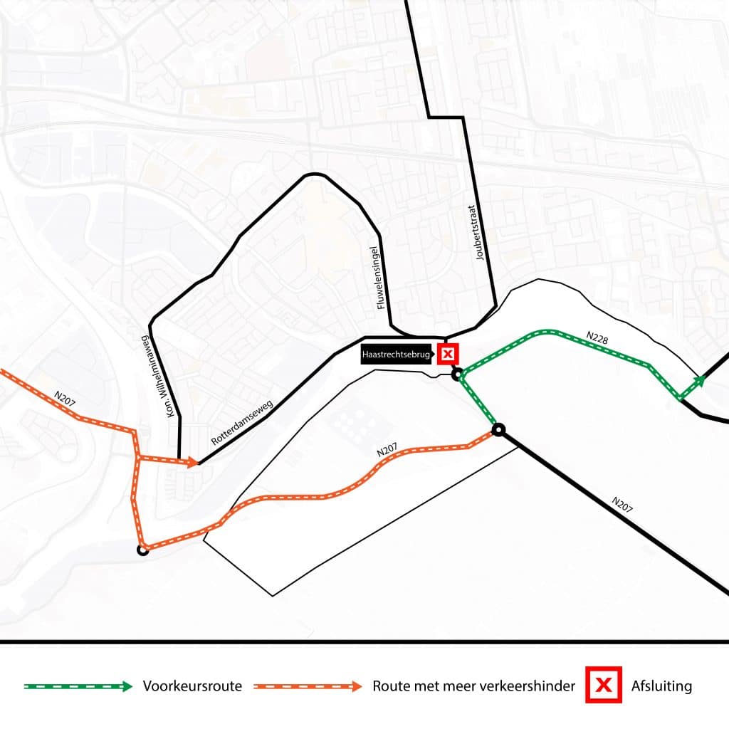 Het autoverkeer wordt omgeleid via de Goverwellebrug en de Gouderaksebrug. De omleidingsroutes lopen via de N207 (oranje stippellijn richting de Gouderaksebrug) en de N228 (groene stippellijn via de Goverwellebrug) en worden met borden aangegeven. Door de omleidingen wordt het drukker op deze bruggen en de omliggende wegen.
